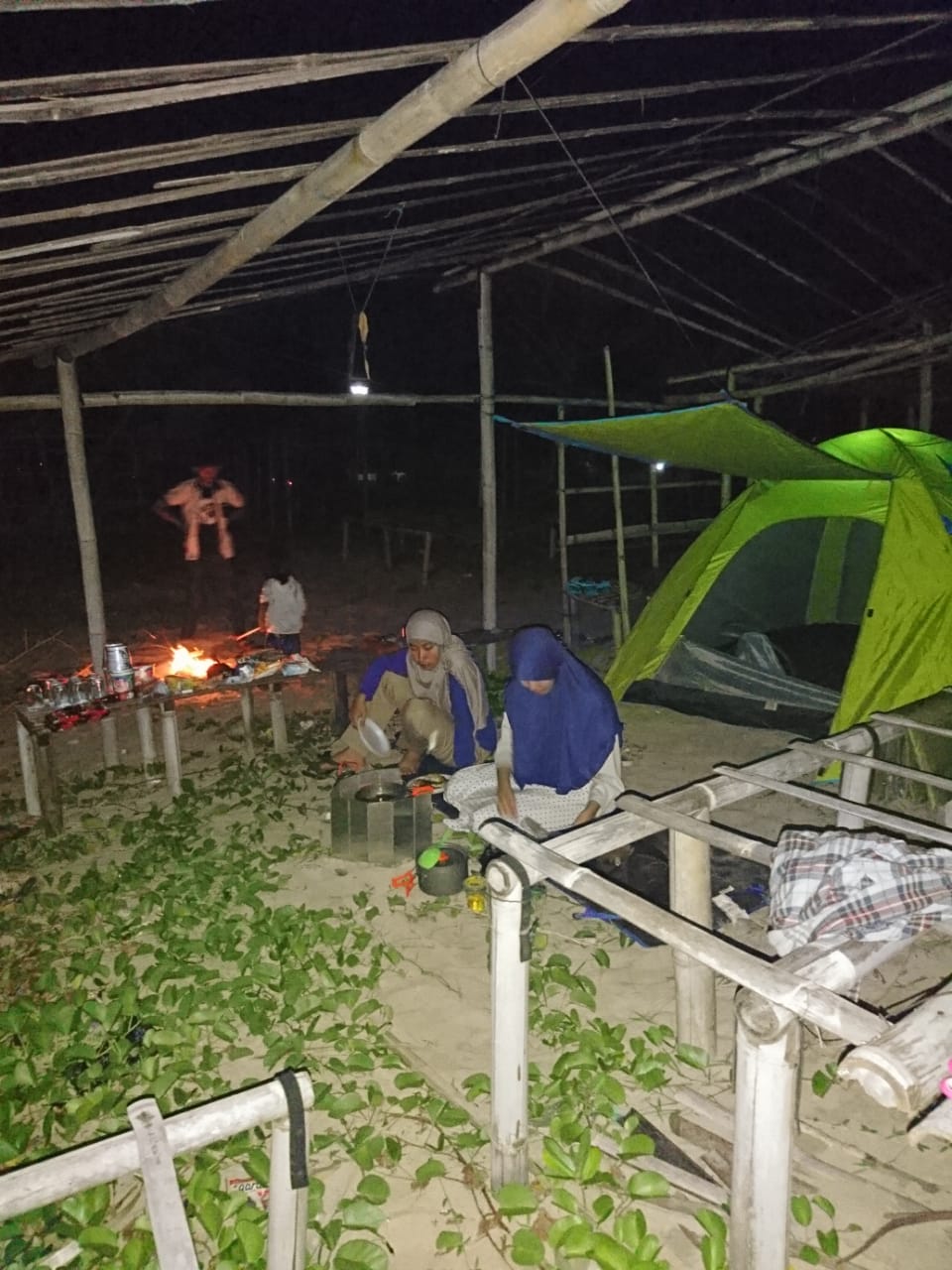Cukup jauh berjalan, akhirnya kami pun menemukan tempat terbaik untuk mendirikan tenda. Tenda didirikan hanya sekitar 10 meter dari bibir pantai. Ketika sedang pasang, air laut sampai hanya berjarak 3 meter dari tenda kami. Setelah tenda berdiri, hari mulai gelap, kami membuat minuman hangat sambil mengobrol dan bersenda gurau. Itonk memasak, Yance membuat api unggun. Kami bergantian shalat dengan air wudhu seadanya. Kiblat mengarah ke laut, sensasi yang luar biasa memang shalat di pinggir pantai, apalagi menghadap laut. Selepas isya kami pun makan seadanya, nasi liwet, telur, dan ikan asin. Tapi jangan salah, dengan lauk seadanya pun terasa sangat nikmat. Kami pun menikmati sisa malam dengan bermain gitar sambil bernyanyi. Beruntungnya aku, masih dapat merasakan kenikmatan seperti ini.