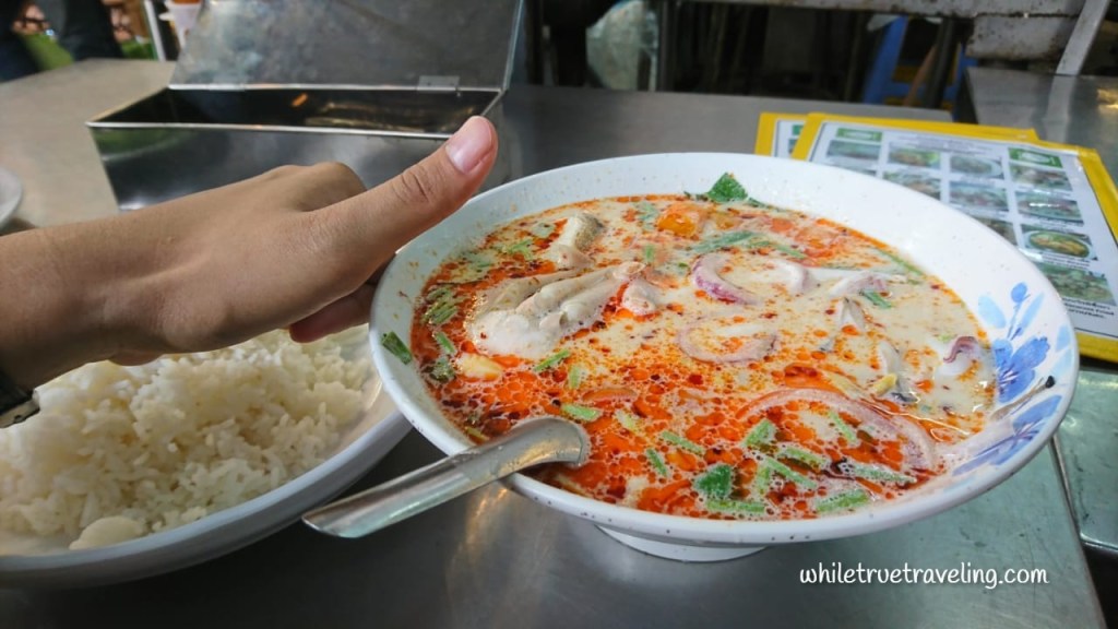 Setelah menunggu, akhirnya pesananku datang. Semangkuk tom yum dan sepiring nasi. Tak disangka, porsinya duuh, bisa untuk dua orang! Segera kuseruput kuahnya yang berwarna putih dengan minyak berwarna kemerahan itu. Walapun berwarna merah, tapi kuahnya tak pedas. Kalau ingin pedas bisa ditambahkan bubuk cabai yang disediakan. Tom yum ini berisi sea food, ada kepitingnya juga. Dan rasanya memang seenak itu, bikin nagih. The best tom yum I’ve ever had. Mungkin karena memang itu yang pertama dan satu-satunya tom yum autentik Thailand yang pernah kucoba. Seporsi tom yum dibanderol dengan harga 300 baht, tahun 2018. Lumayan mahal memang, namun mengingat seporsinya bisa untuk dua orang, menurutku boleh laah.