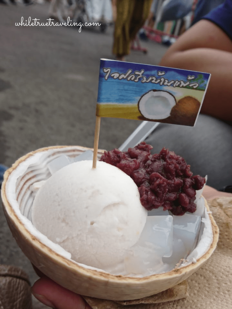 Es krim kelapa khas Thailand jadi jajanan pembuka kami. Penyajiannya unik dan menarik. Es krim kelapa disajikan bersama nata de coco dan pasta kacang merah menggunakan batok kelapa sebagai mangkuknya. Segelas air kelapa disajikan bersamaan. Es krim yang gurih dan creamy, berpadu dengan tekstur nata de coco yang kenyal dan pasta kacang merah yang memiliki manis yang khas, tak disangka menjadi paduan yang sempurna. Rasa haus yang ditimbulkan setiap habis makan es krim bisa langsung diredakan oleh segelas air kelapa yang diberikan secara cuma-cuma oleh penjual. Ahh, nikmat!