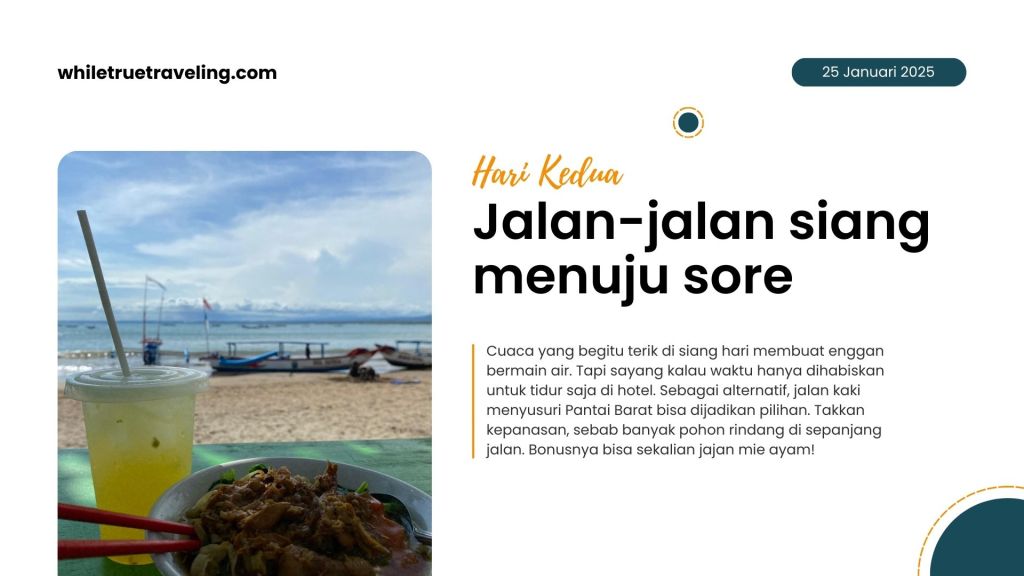 Lalu siang menuju sore, sekitar pukul 14.30, aku dan suami berjalan santai di pinggir pantai, menyusuri Pantai Barat hingga pintu masuk Cagar Alam. Soundtrack lagu Hidupku Kan Damaikan Hatimu milik Caffeine terngiang di kepalaku. Sembari istirahat duduk di pinggir pantai, mi ayam dan es jeruk menemani kami. Nikmat!